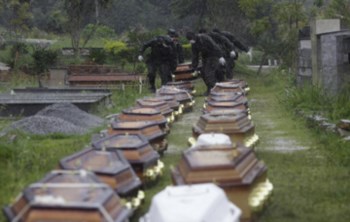 "Os corpos chegam aqui, são limpos, fotografados, mostramos a fotografia dos cadáveres às pessoas e elas identificam os parentes", explica um técnico do Governo do Estado do Rio de Janeiro, um dos muitos enviados para a região serrana. "Até agora, passaram por aqui 248 corpos, 34 ainda não identificados. Depois saem daqui já nos caixões."
